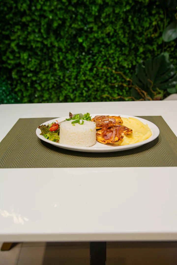 Mix de salada fresca, peito de frango grelhado, arroz soltinho e purê de batata cremoso. Uma combinação saudável e saborosa!
