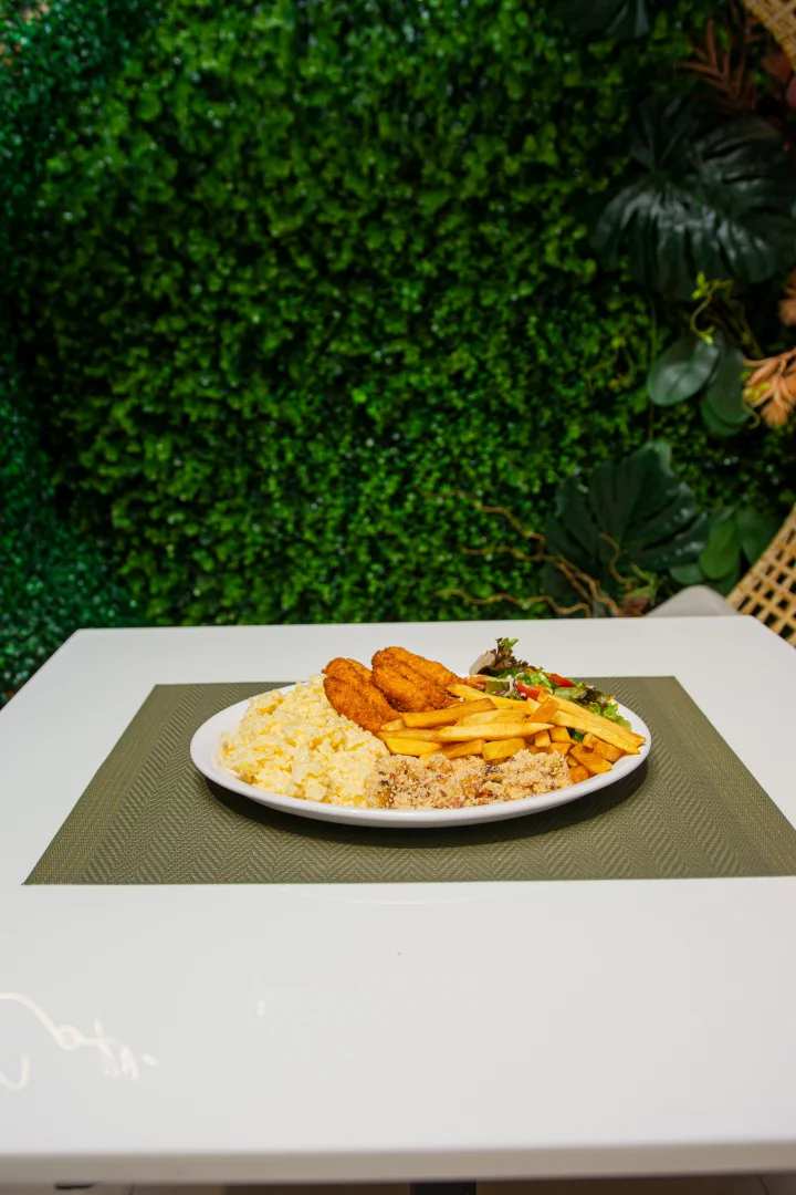 Mix de salada, filé de peixe empanado crocante, arroz branco soltinho, batata frita dourada e farofa de banana. Uma combinação leve e saborosa!