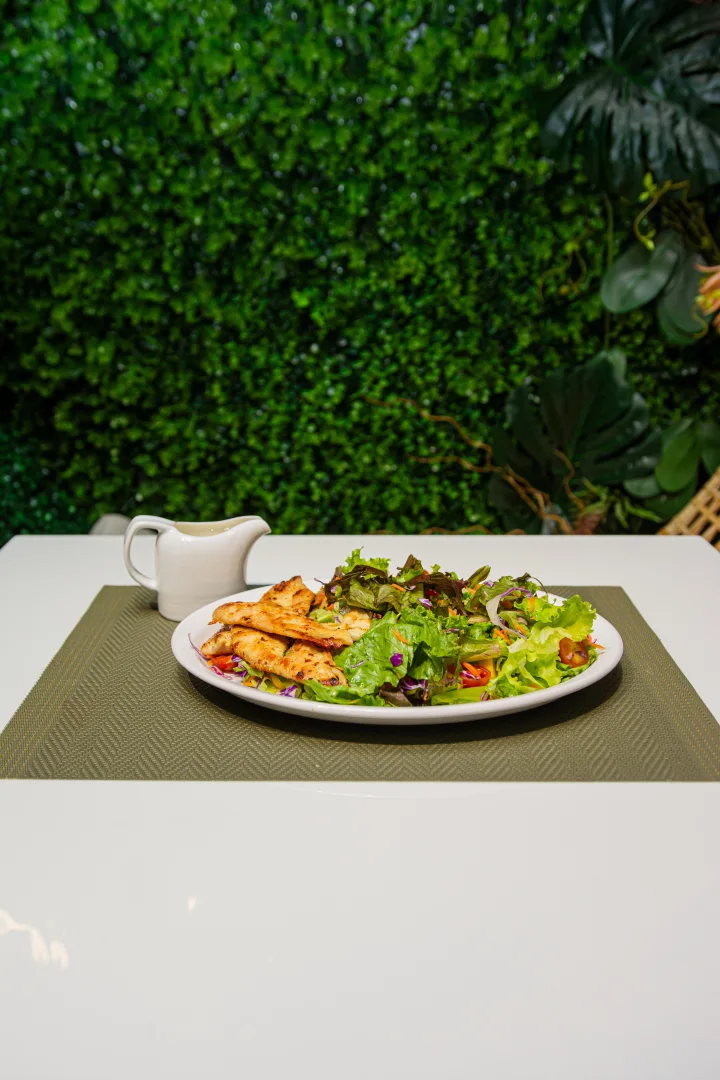 Mix de salada fresca, peito de frango grelhado, arroz soltinho e purê de batata cremoso. Uma combinação saudável e saborosa!