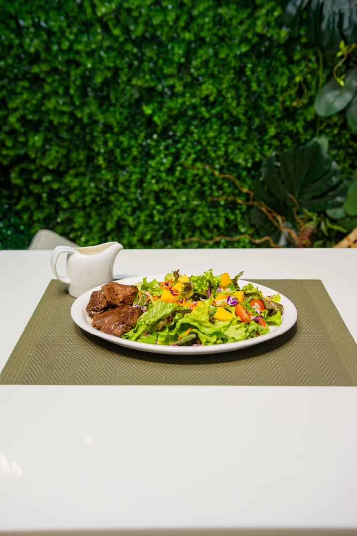 Mix de salada fresca, filé bovino grelhado, arroz soltinho e purê de batata cremoso. Uma combinação saudável e saborosa!