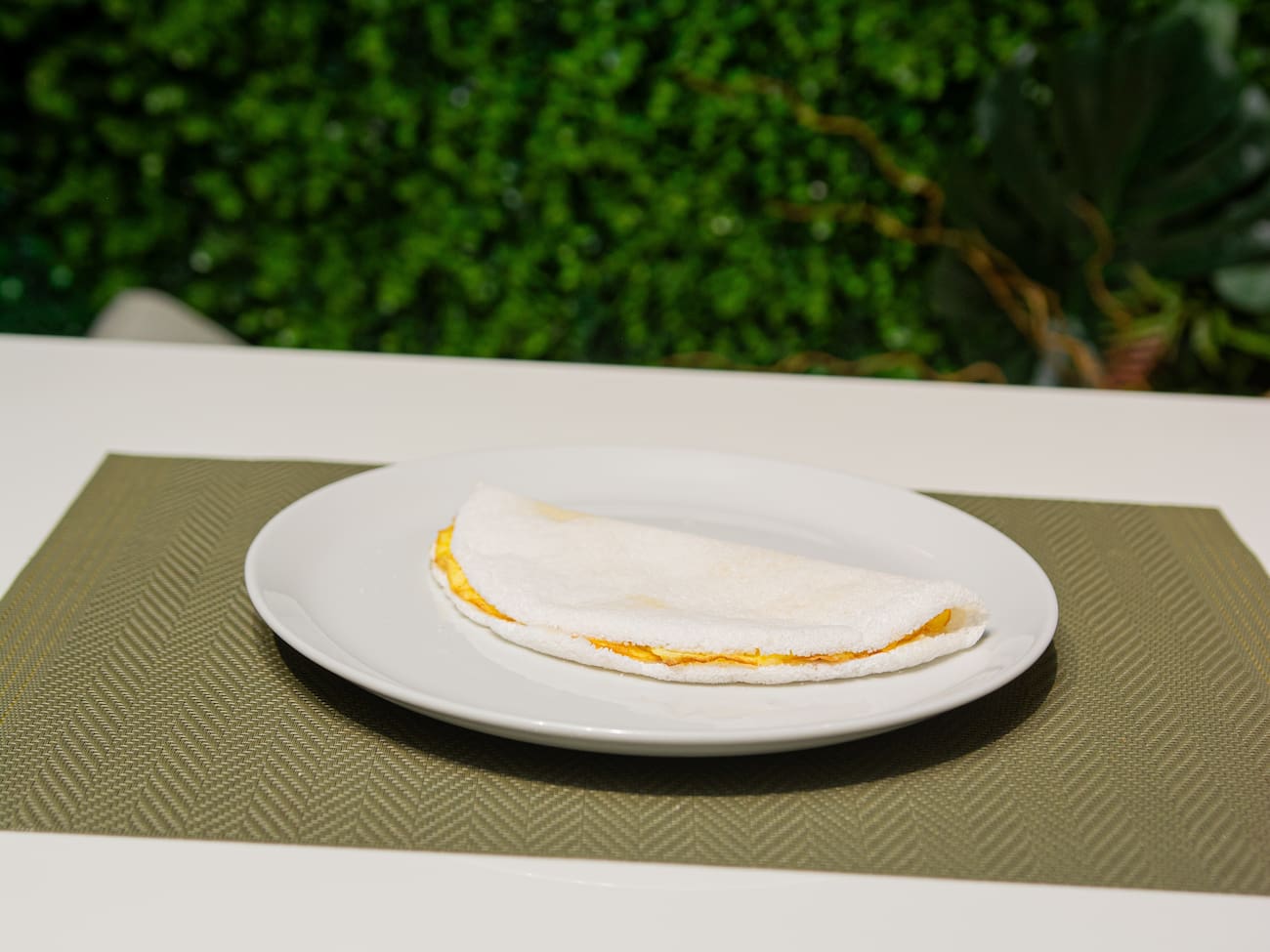 Tapioca quentinha recheada com ovo e queijo mussarela derretido.