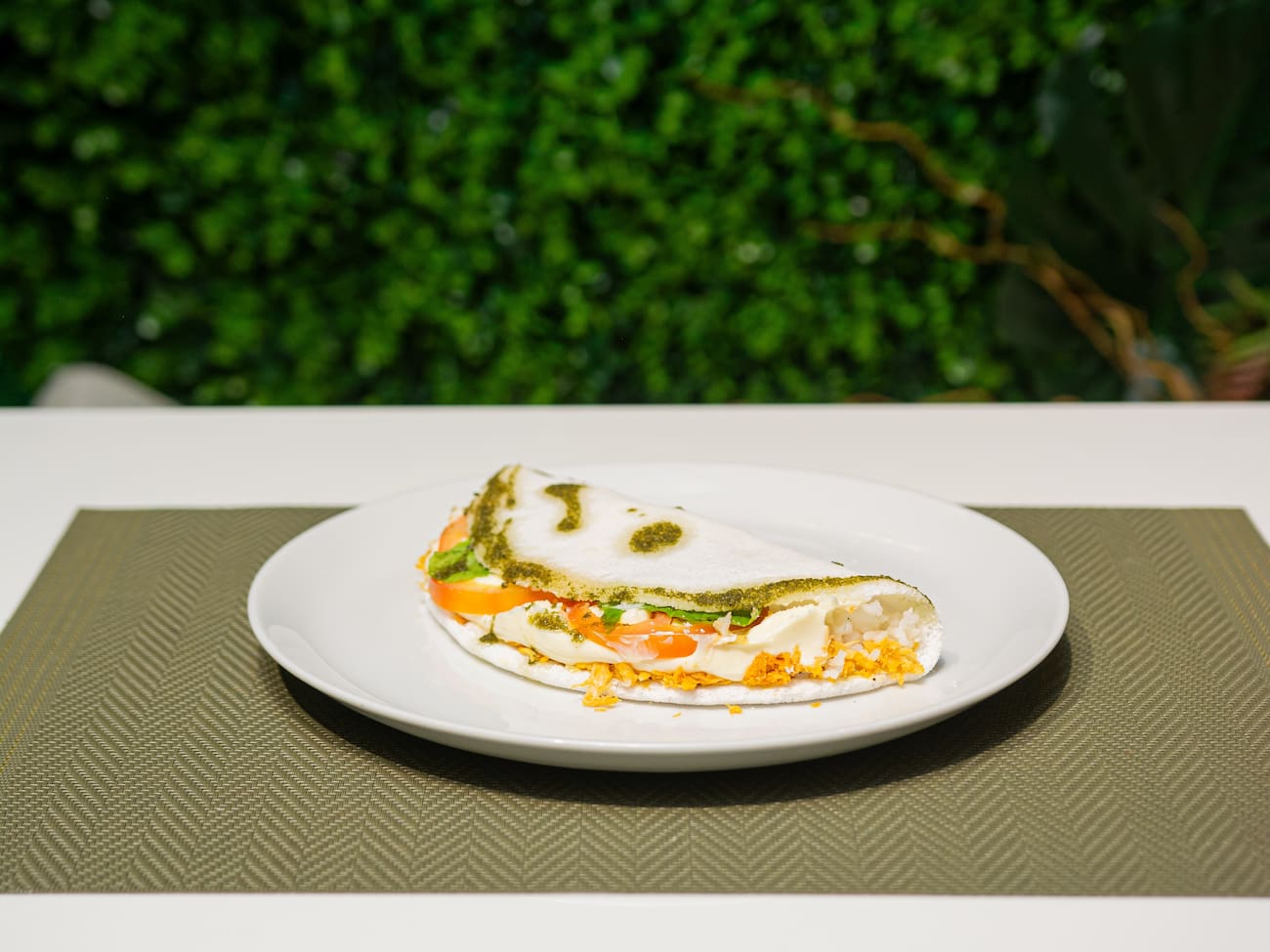 Recheada com queijo coalho, requeijão cremoso, chutney de tomate, manjericão fresco, rúcula e um toque especial de molho pesto.